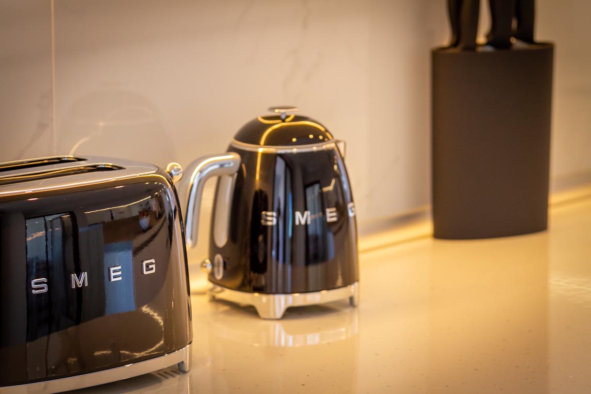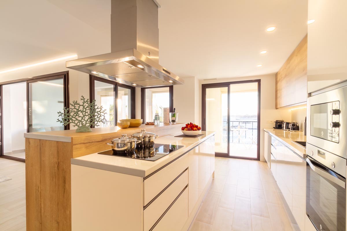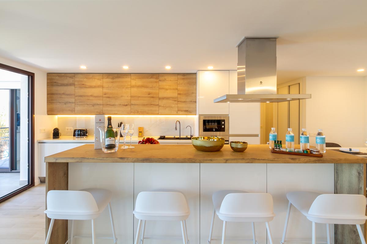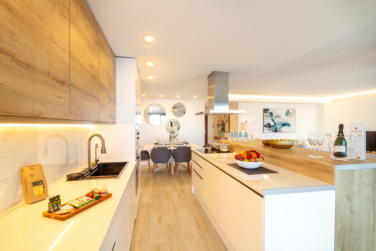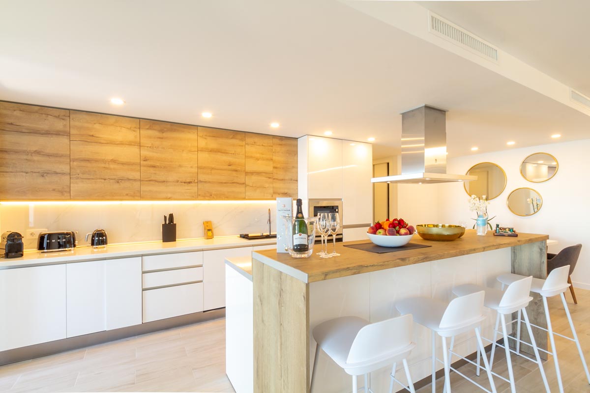 El apartamento cuenta con una cocina totalmente equipada con electrodomésticos de última generación.