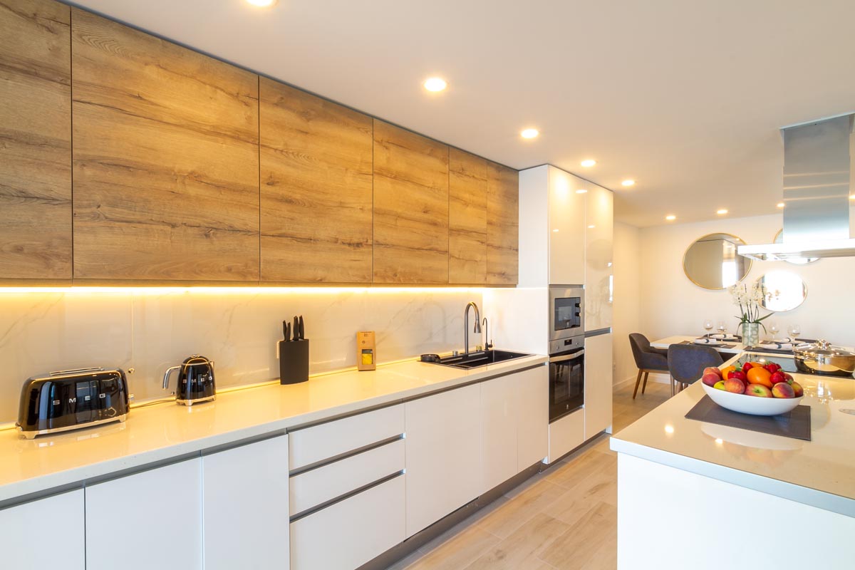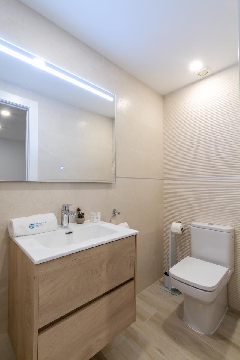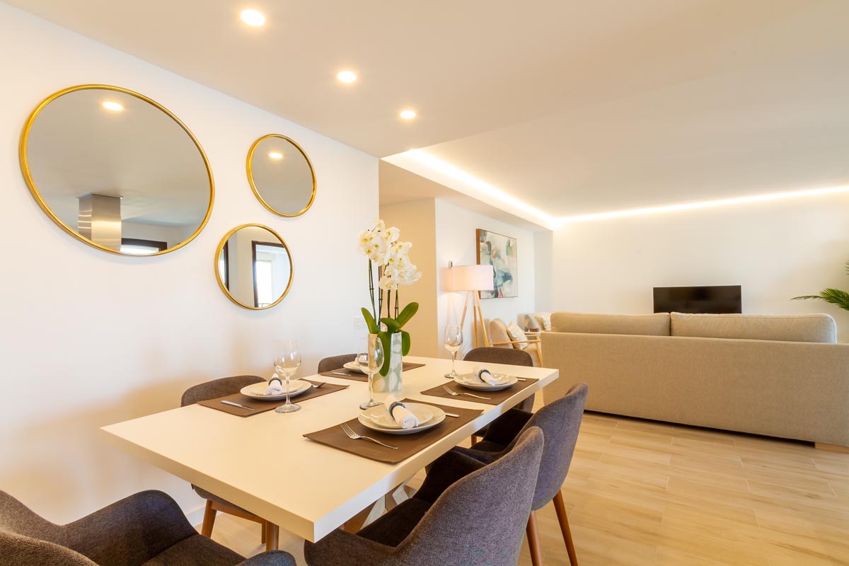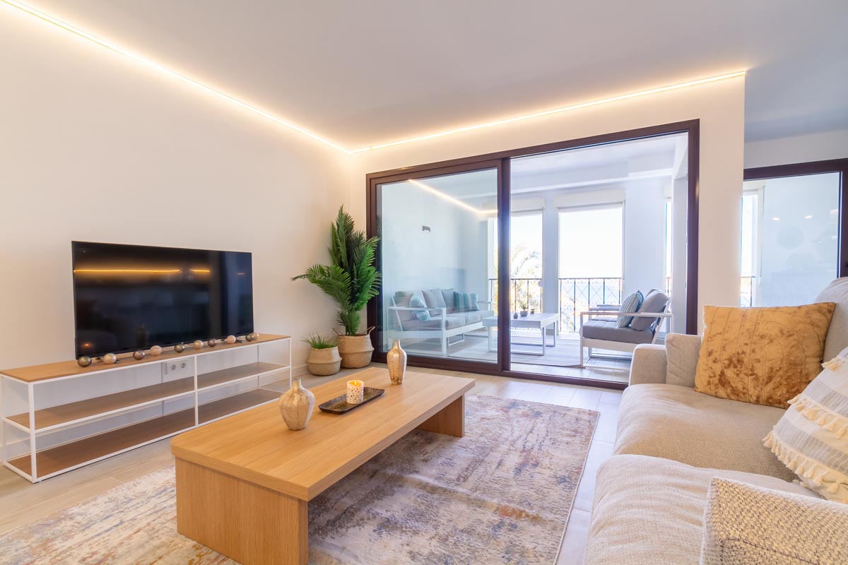 La sala de estar y el comedor, integrados con la cocina, son amplios y confortables y tienen ventanas directas al balcón sobre el paseo peatonal que va paralelo a la playa. Desde este fantástico balcón puedes contemplar la belleza del Mar Mediterráneo mientras disfrutas del inigualable clima de verano marbellí.