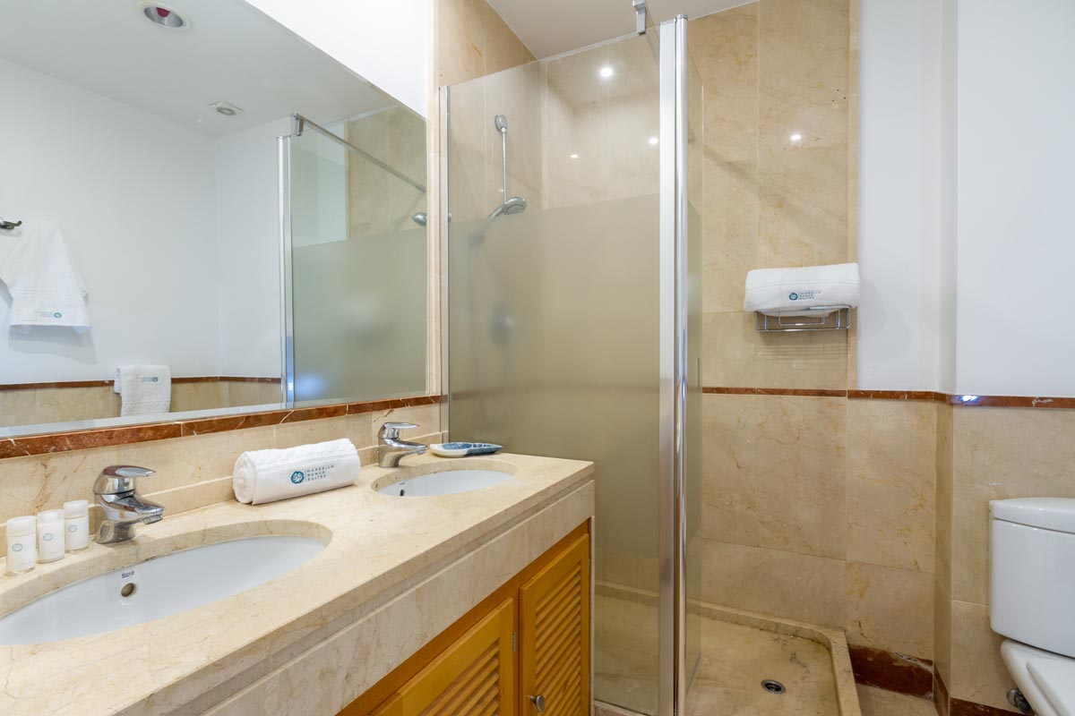 El dormitorio principal cuenta con una cama Queen Size, armarios empotrados con caja de seguridad digital, TV y baño en suite. El segundo dormitorio también tiene una cama Queen Size, un baño en el pasillo y armarios espaciosos.
