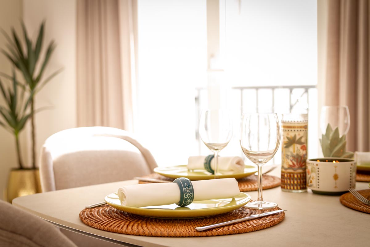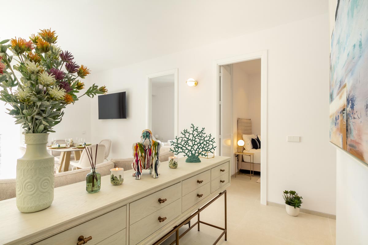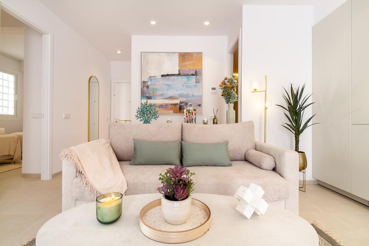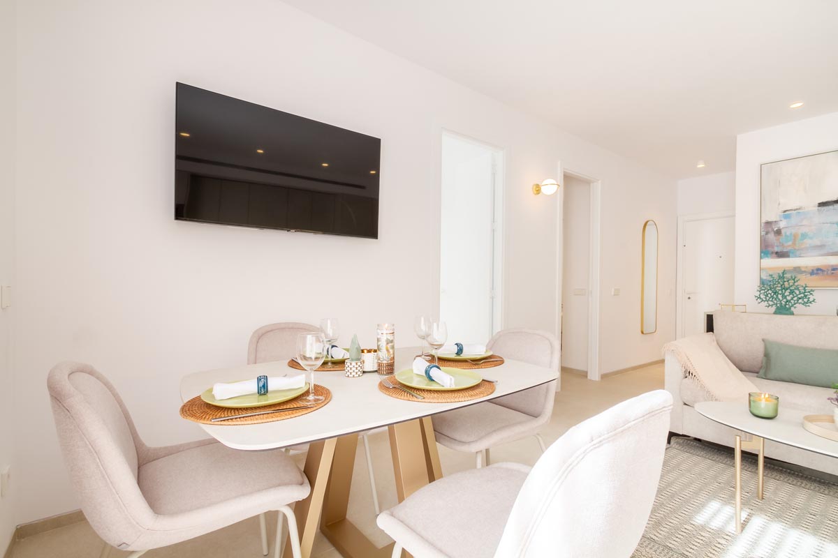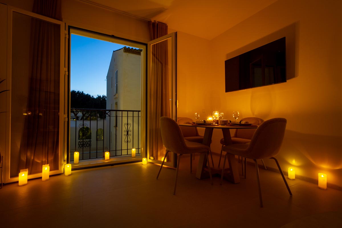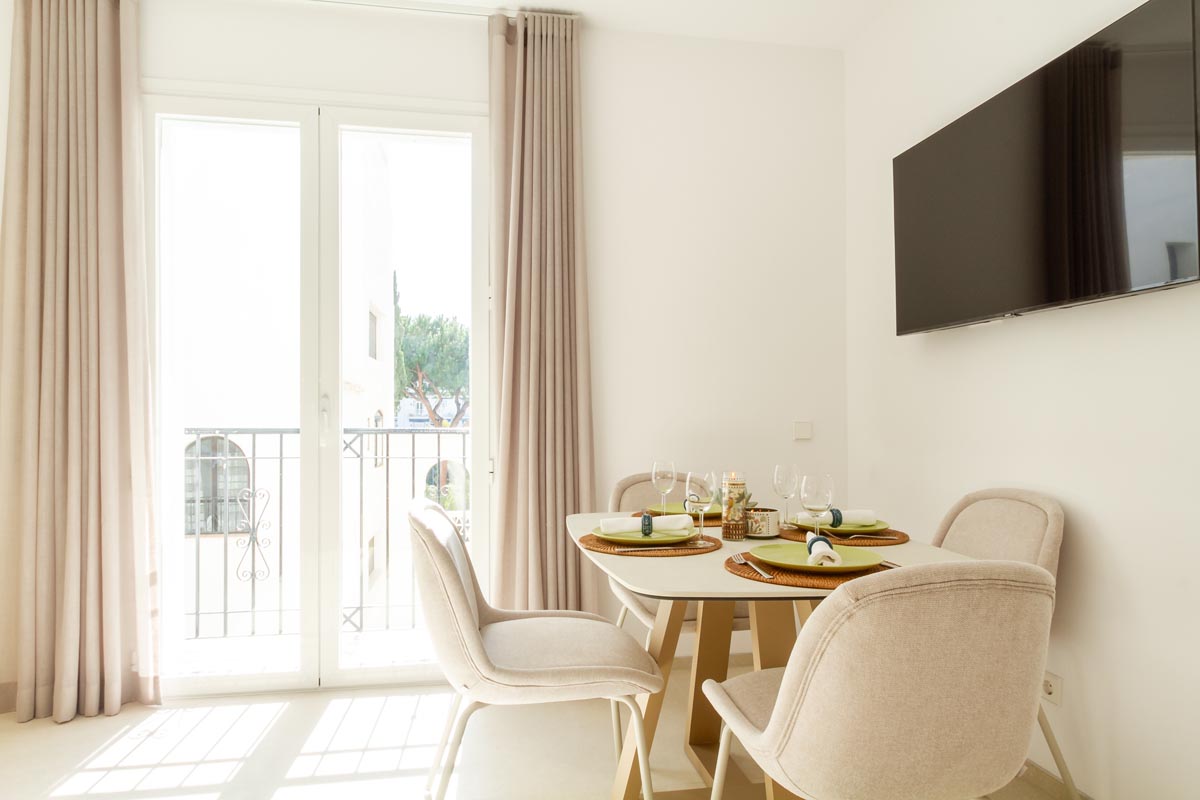 Desde la sala de estar, tienes vistas a la ventana que da al exterior de la urbanización. Este rincón especial te permitirá relajarte mientras disfrutas del momento previo a la cena, después de un bellísimo día de playa.