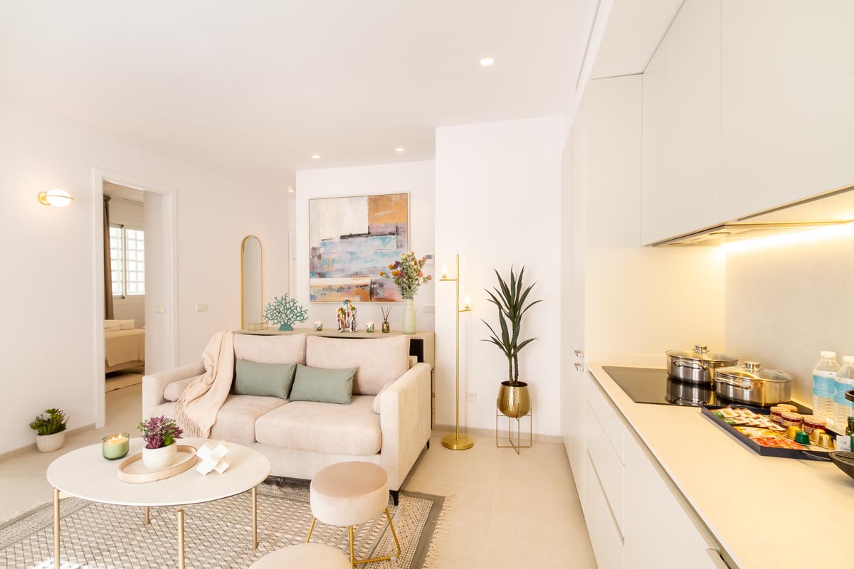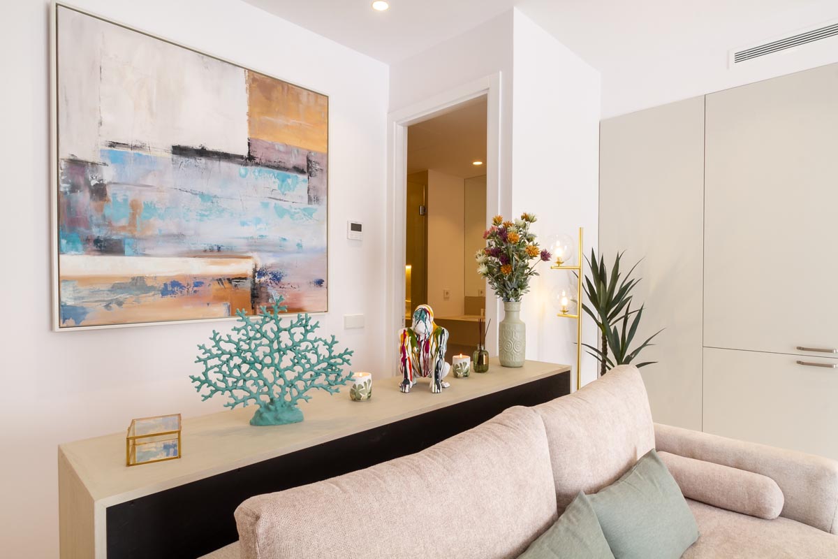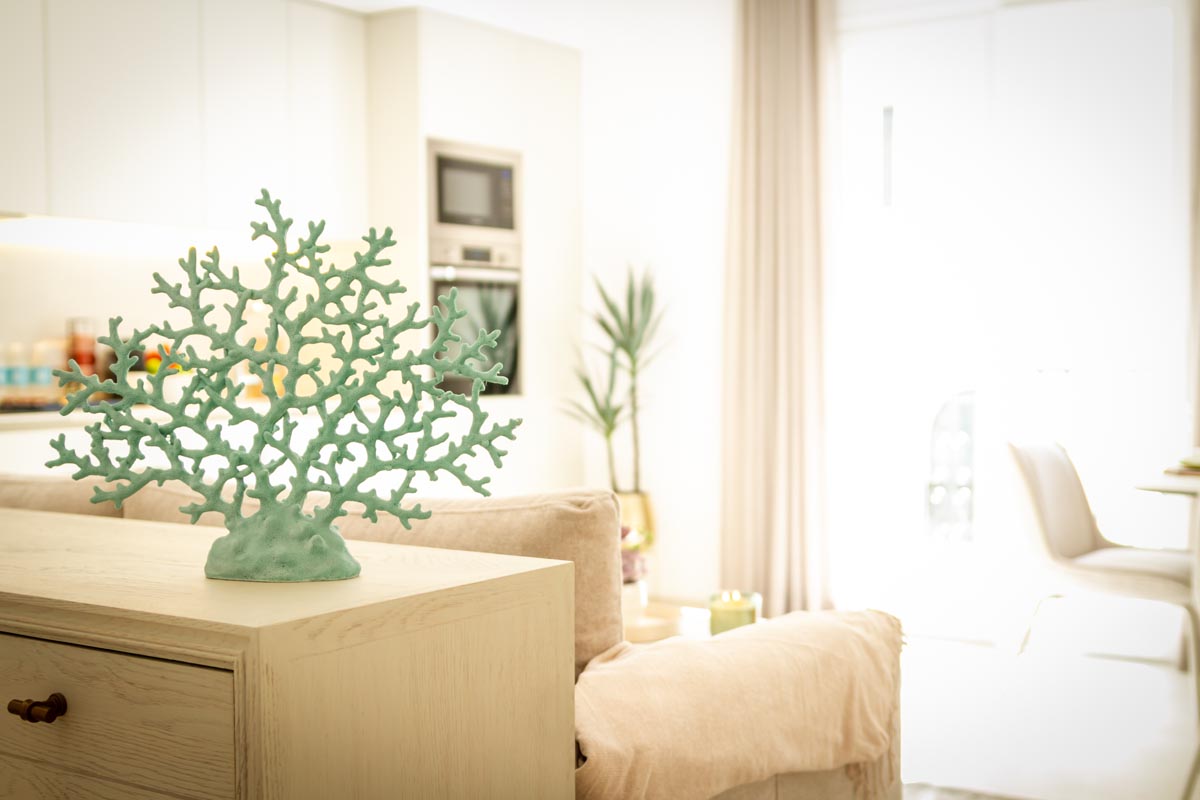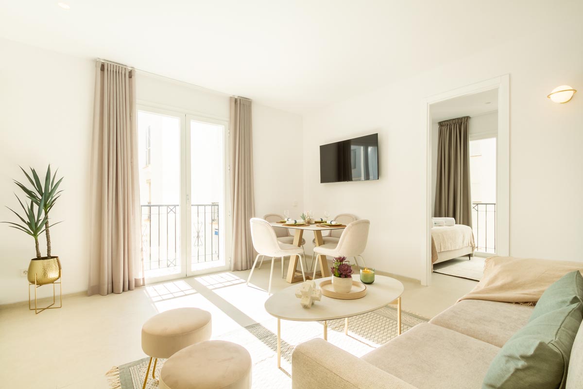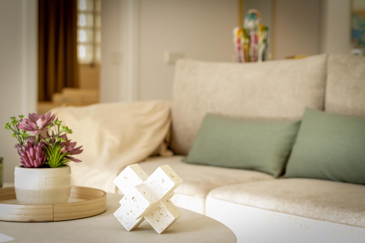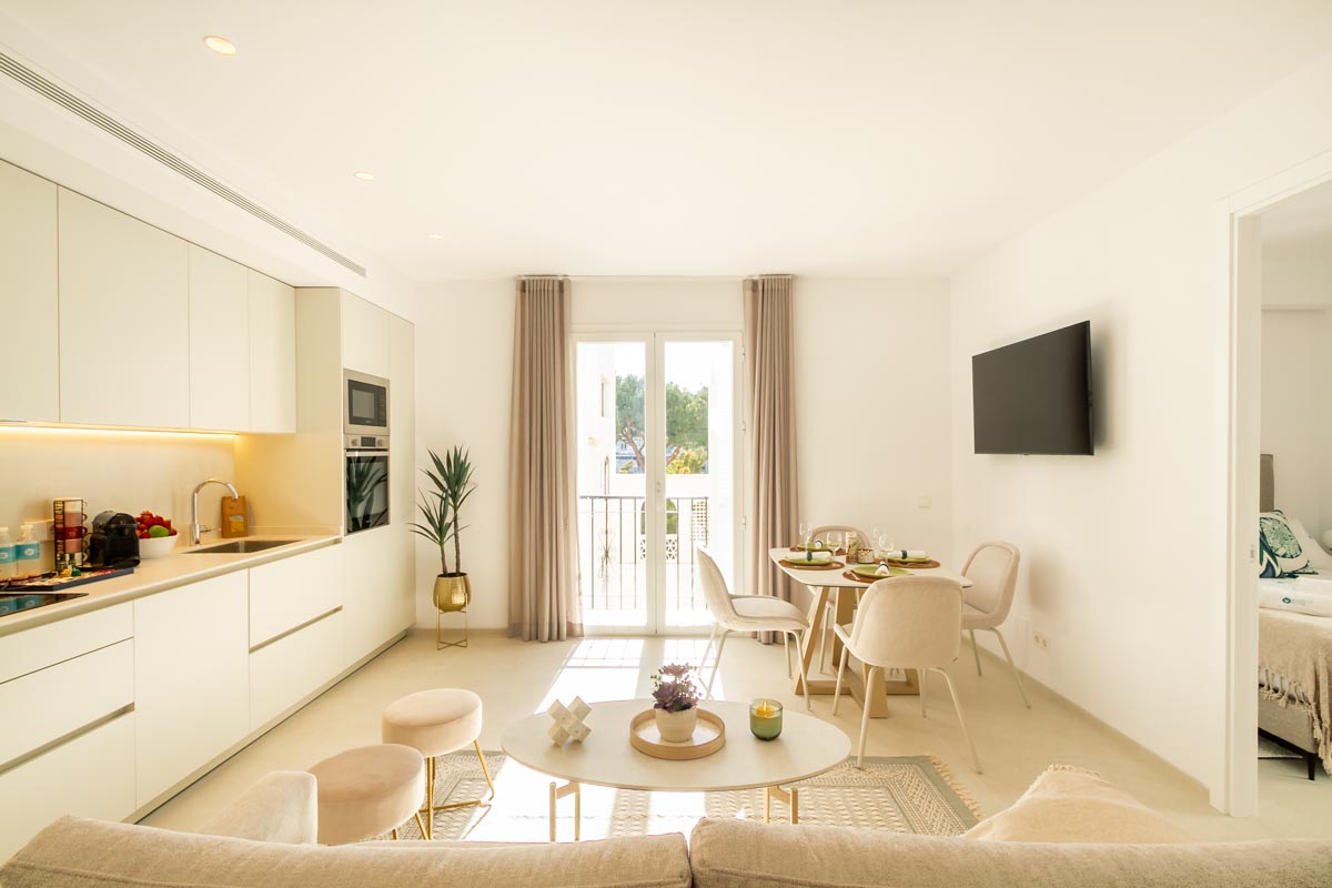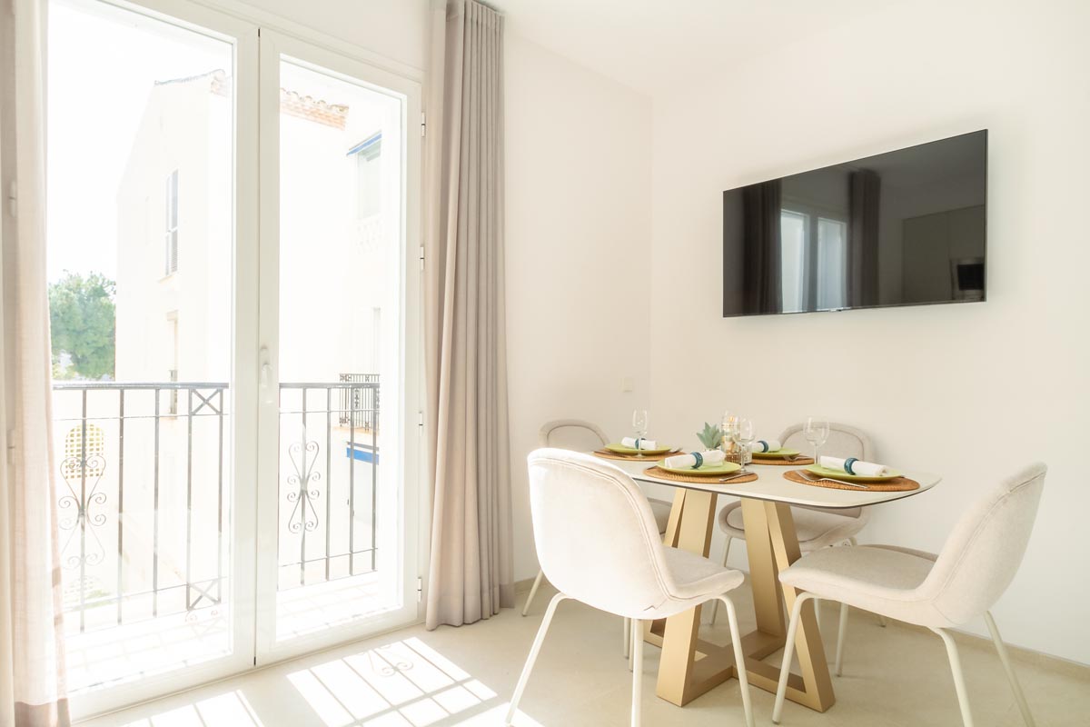 Desde la sala de estar, tienes vistas a la ventana que da al exterior de la urbanización. Este rincón especial te permitirá relajarte mientras disfrutas del momento previo a la cena, después de un bellísimo día de playa.