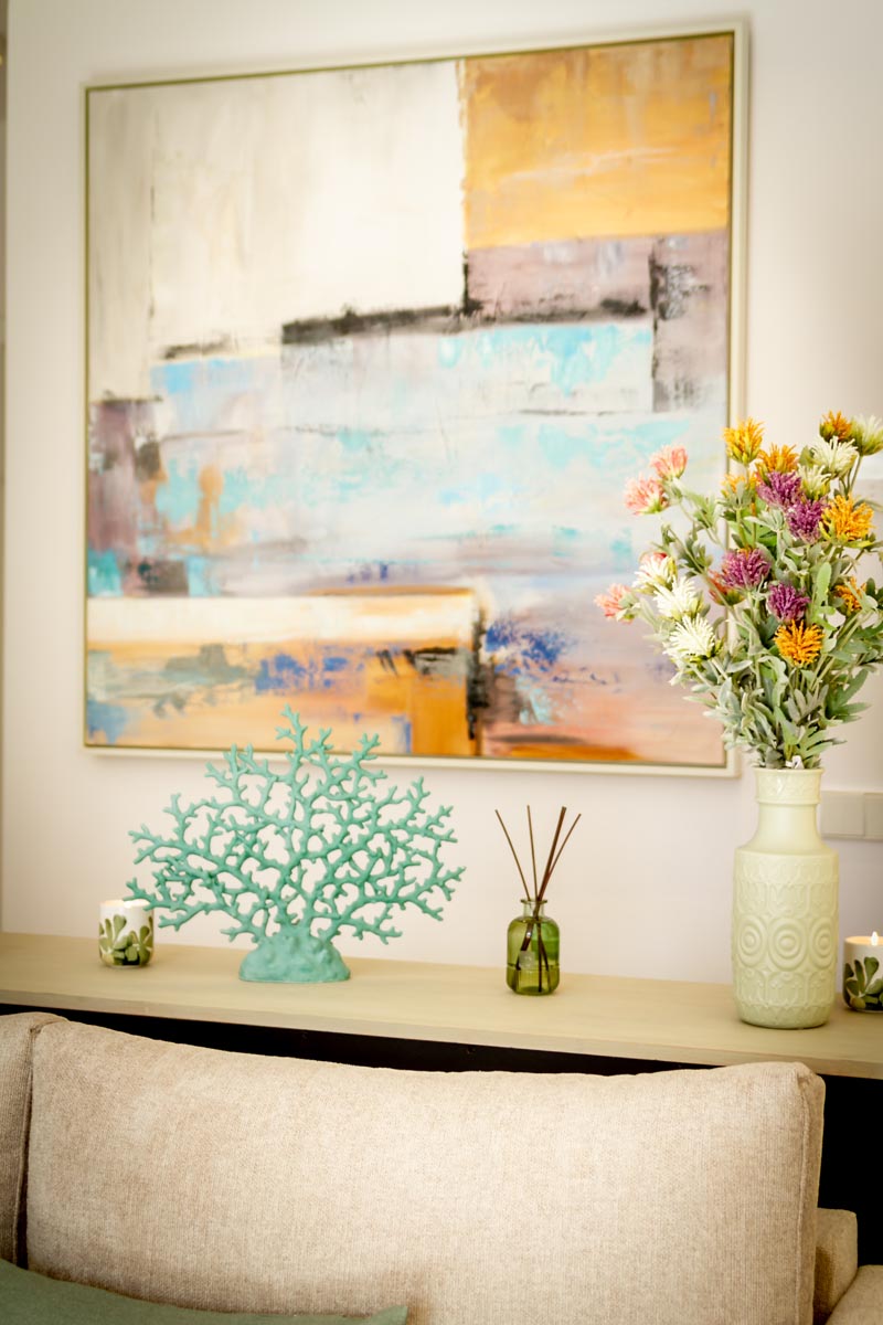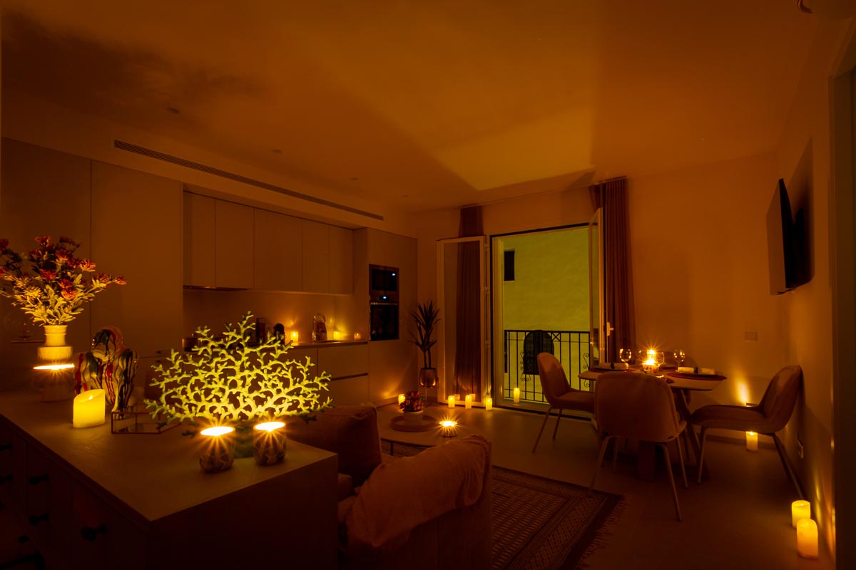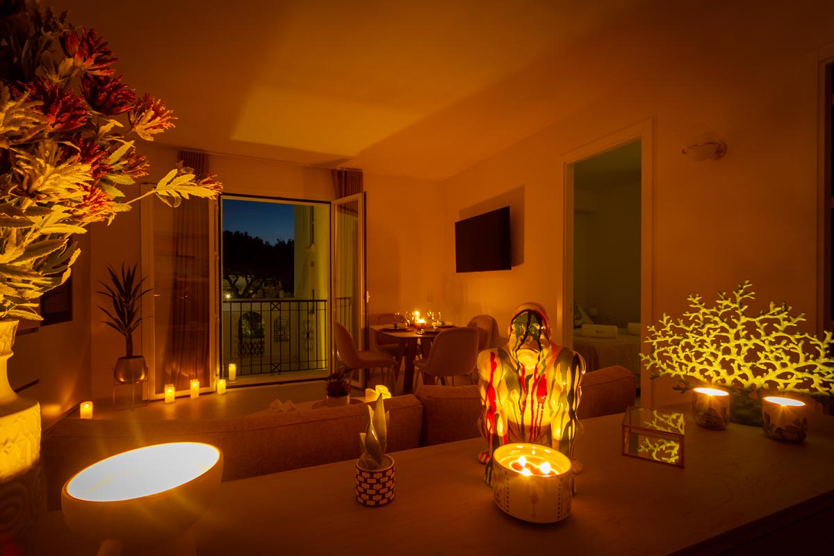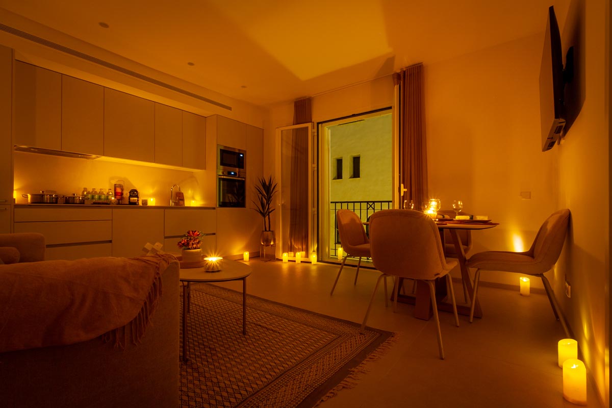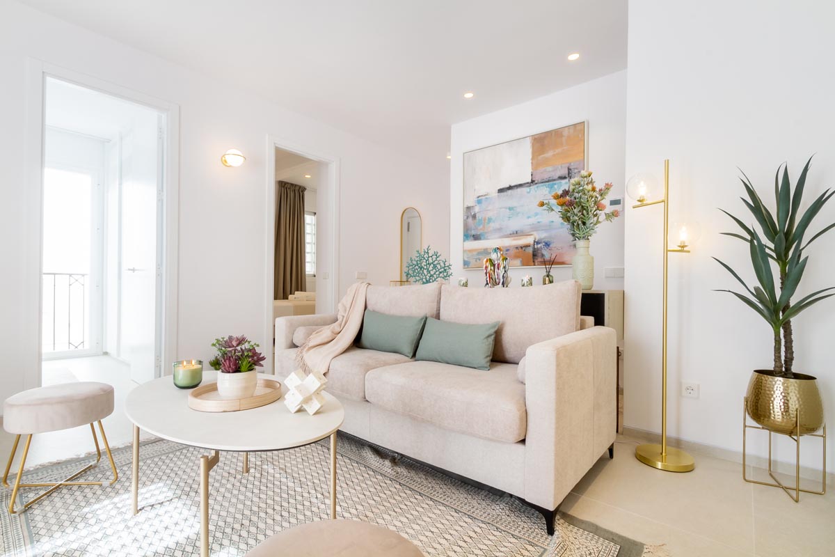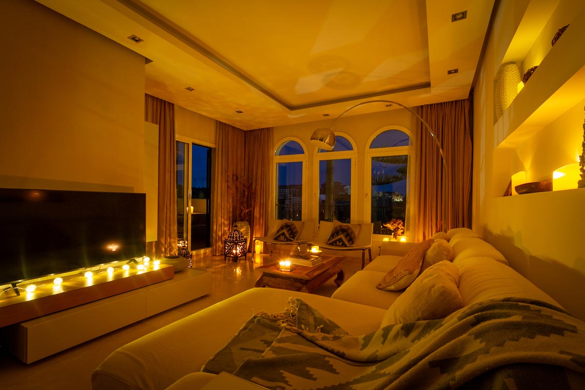 Desde la sala de estar, tienes vistas a la ventana que da al exterior de la urbanización. Este rincón especial te permitirá relajarte mientras disfrutas del momento previo a la cena, después de un bellísimo día de playa.