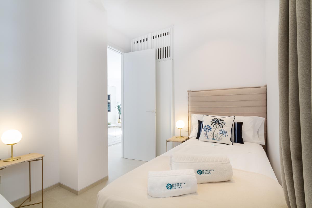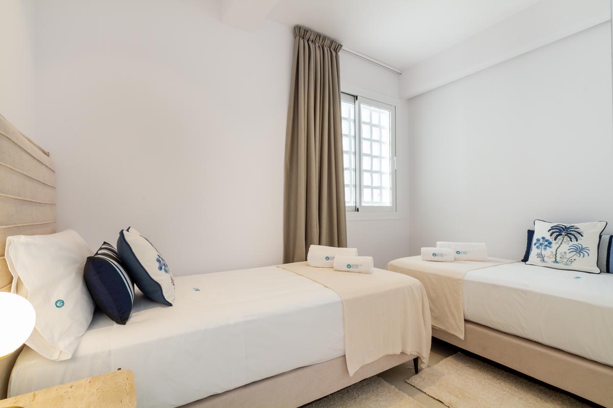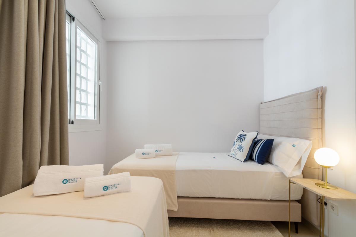 El segundo dormitorio está equipado con dos camas individuales y armarios empotrados, brindando un espacio acogedor para que tus acompañantes se sientan cómodos durante su estadía.