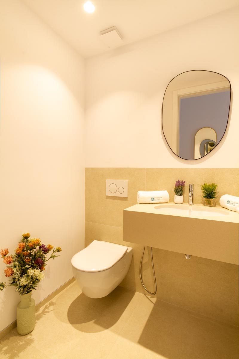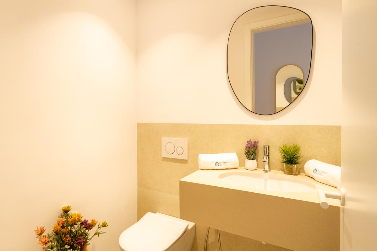 El baño completo se encuentra convenientemente ubicado, proporcionando privacidad y comodidad. Además, el apartamento posee un aseo extra en el pasillo de entrada.