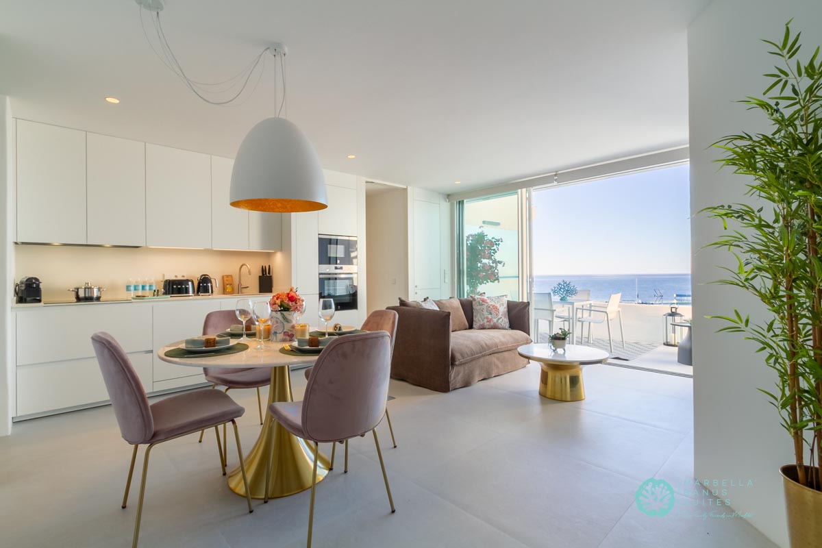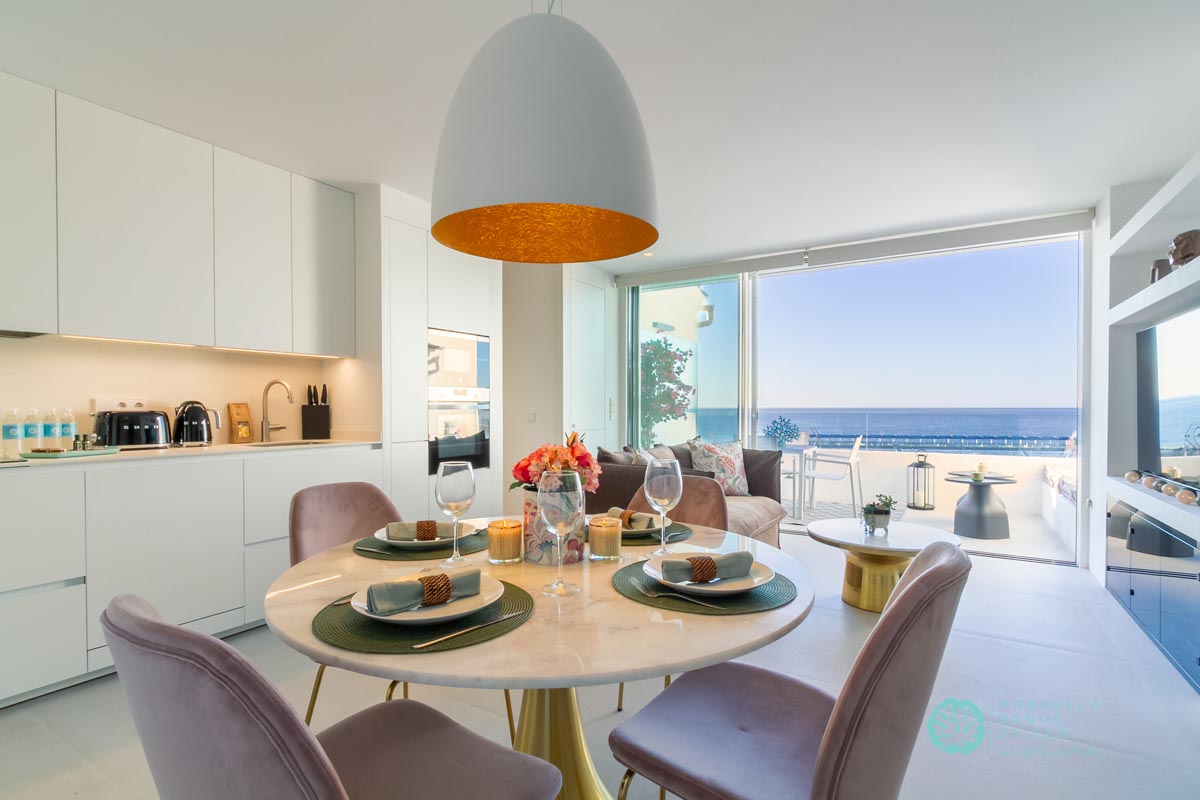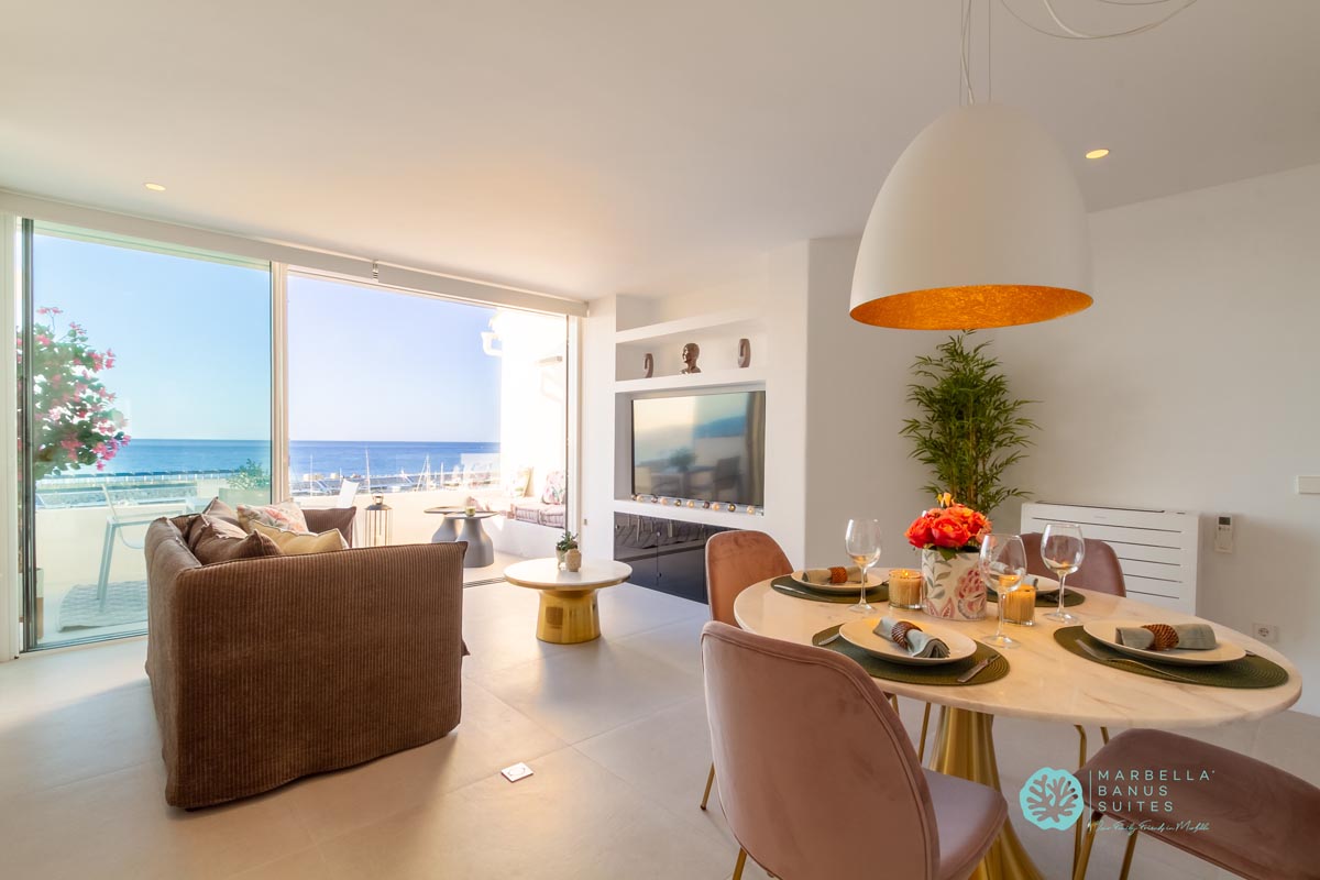 La sala de estar y el comedor están integrados, son confortables y tienen vistas directas al mar a través de la ventana que da a la terraza exterior. Desde esta fantástica terraza puedes contemplar la belleza del Mar Mediterráneo mientras disfrutas del inigualable clima de verano marbellí. Como puedes observar en las fotos, la terraza tiene muebles de exterior para desayunar, tomar tu aperitivo previo al almuerzo o incluso disfrutar de una cena en las agradables noches de verano.