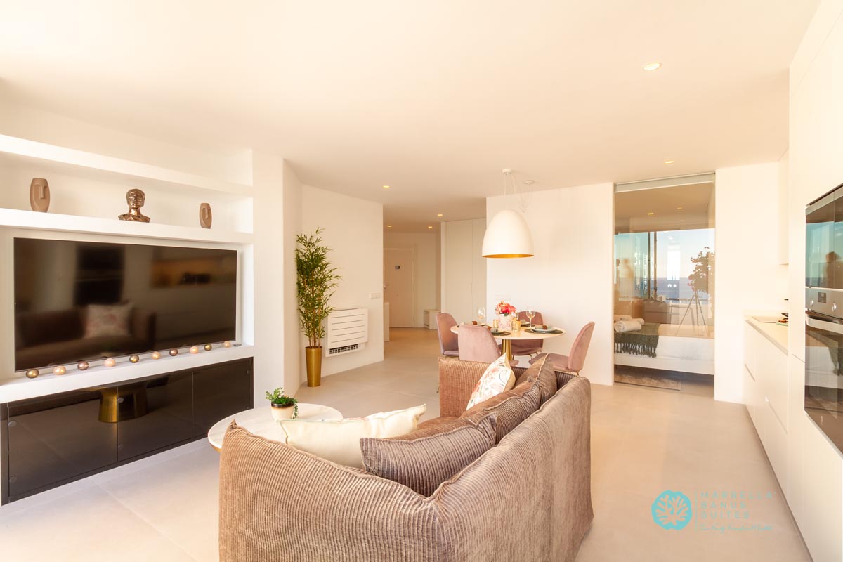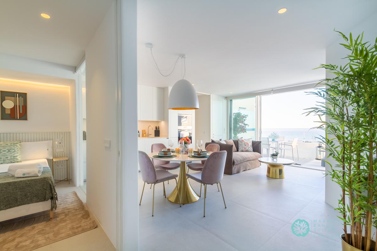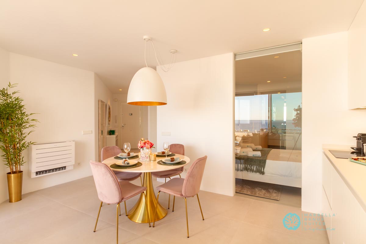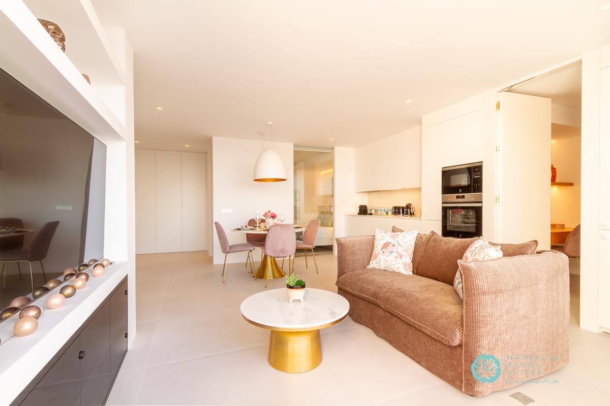 La sala de estar y el comedor están integrados, son confortables y tienen vistas directas al mar a través de la ventana que da a la terraza exterior. Desde esta fantástica terraza puedes contemplar la belleza del Mar Mediterráneo mientras disfrutas del inigualable clima de verano marbellí. Como puedes observar en las fotos, la terraza tiene muebles de exterior para desayunar, tomar tu aperitivo previo al almuerzo o incluso disfrutar de una cena en las agradables noches de verano.