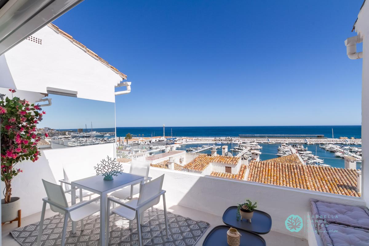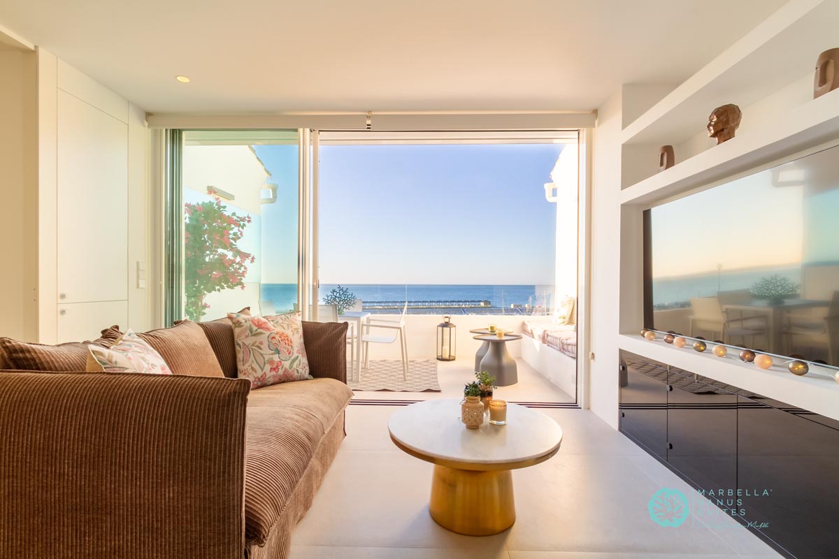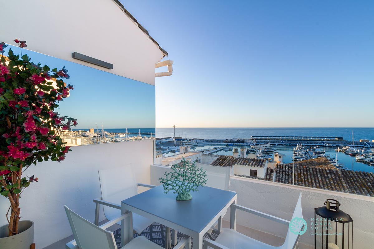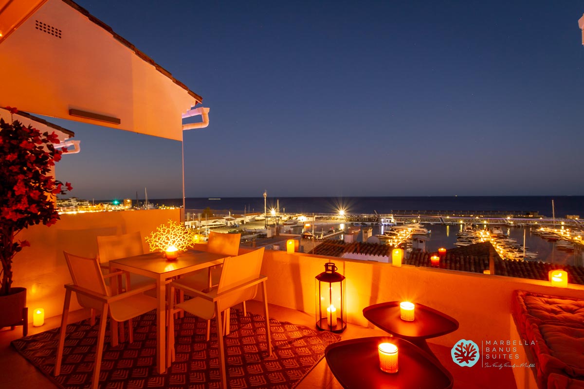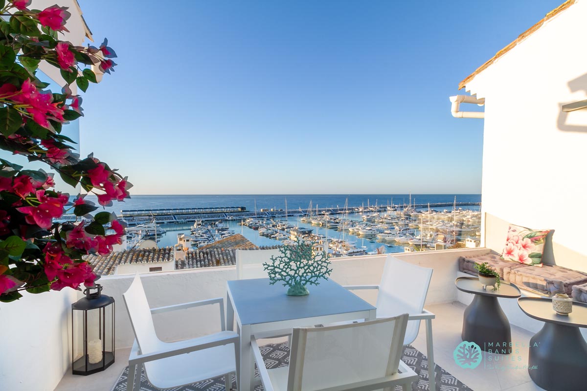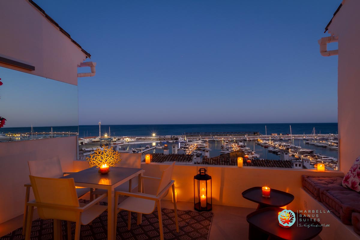 Desde la terraza exterior podrás disfrutar de las vistas directas al mar y a la marina, de los amaneceres y los fantásticos atardeceres multicolores de Marbella.