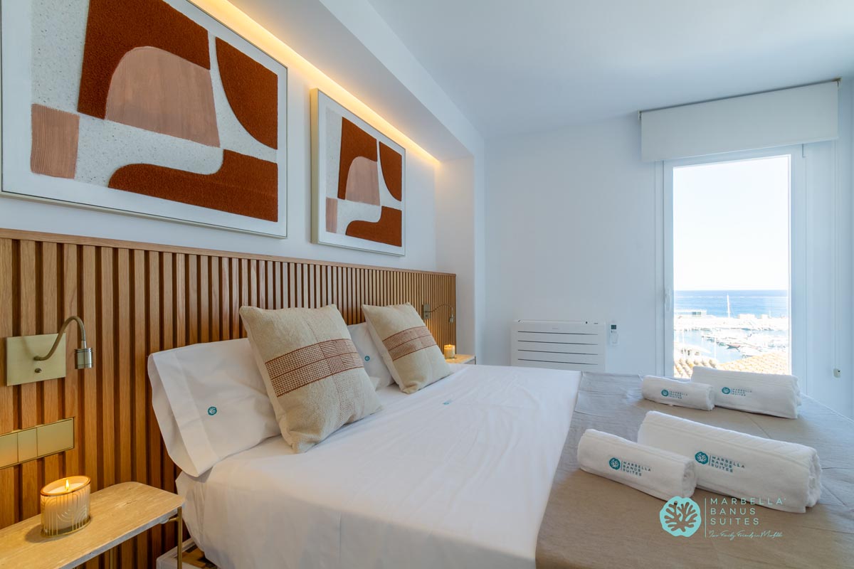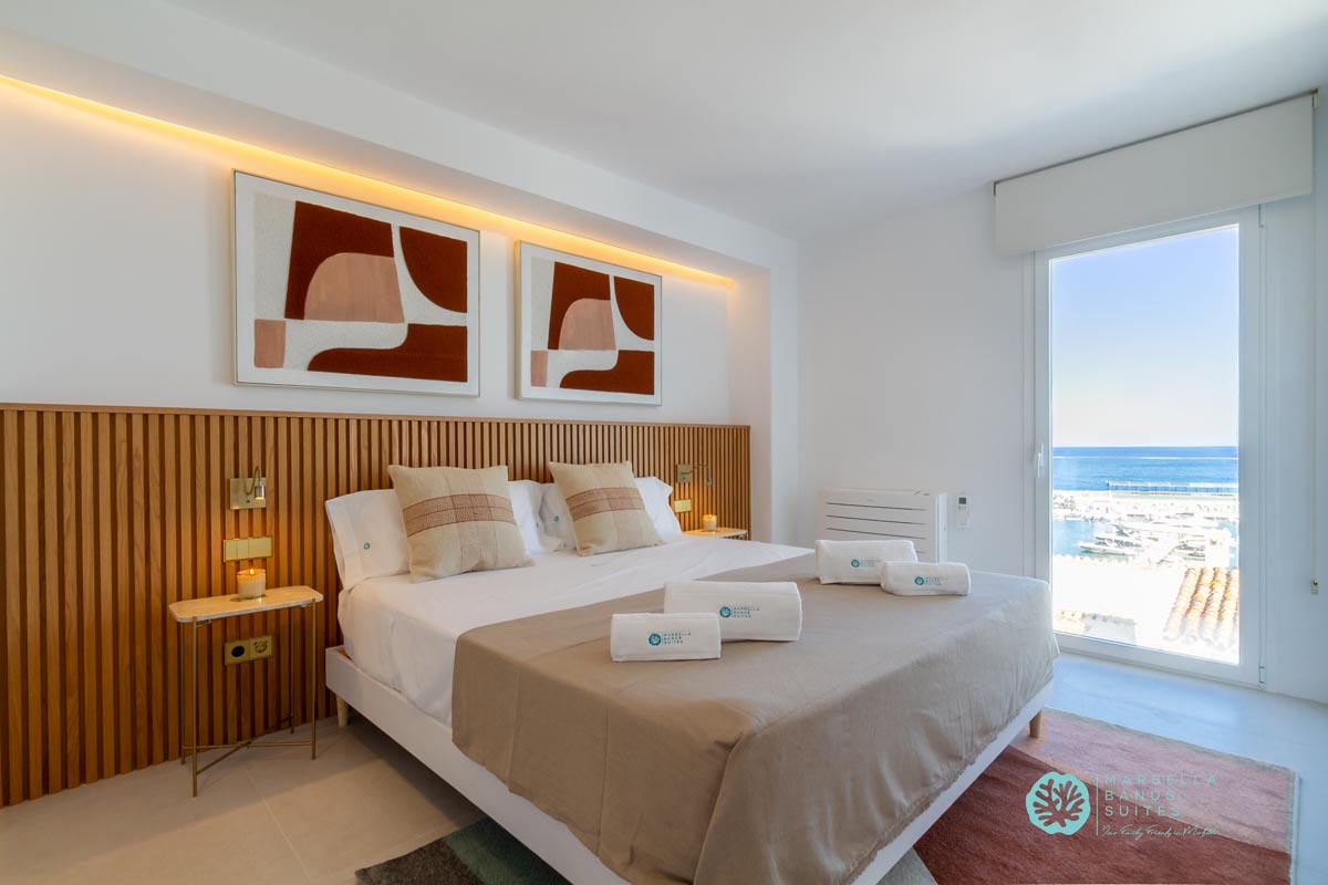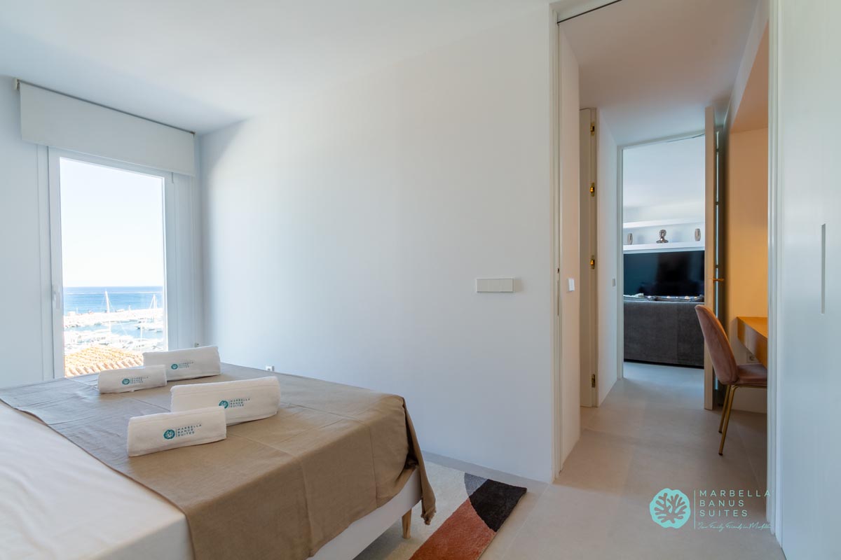 El dormitorio principal tiene vistas al puerto y al mar, las cuales puedes disfrutar desde su cama matrimonial. En la misma habitación hay un armario empotrado y caja fuerte con cerradura digital. Este dormitorio posee un escritorio integrado para conectarte a una llamada importante, ver un evento interesante en tu PC o incluso trabajar online. Este dormitorio tiene su baño en suite que está bellamente diseñado y decorado con exclusivos cerámicos artesanales sevillanos.