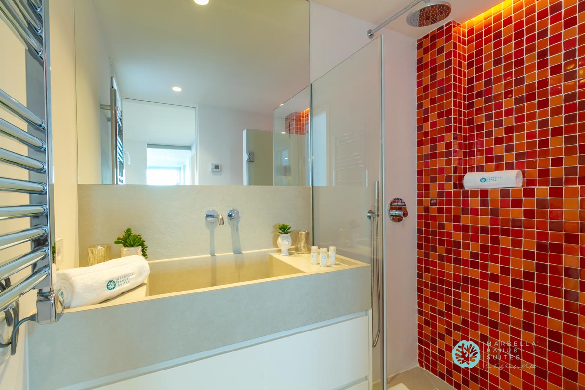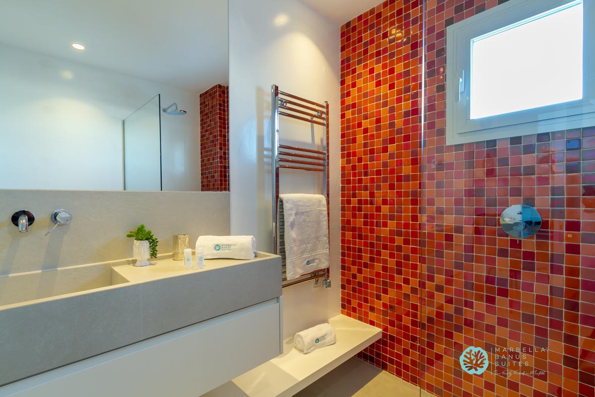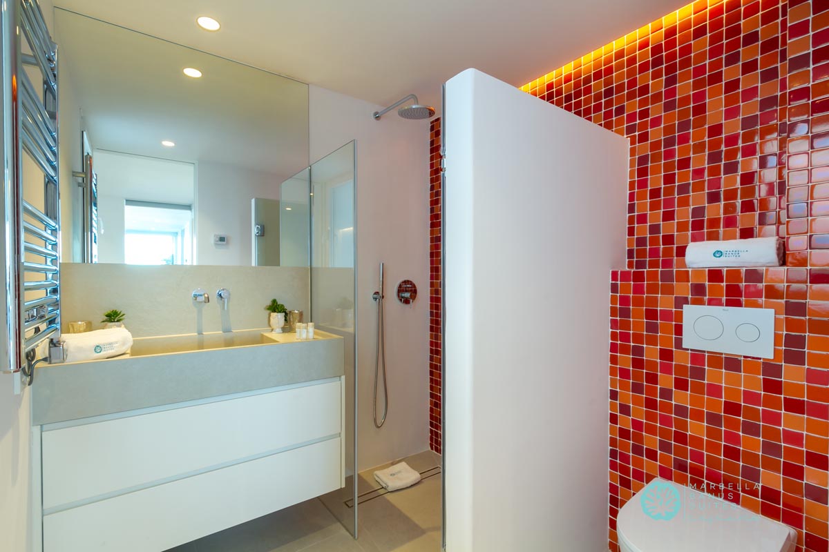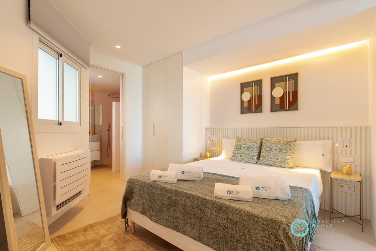 El dormitorio principal tiene vistas al puerto y al mar, las cuales puedes disfrutar desde su cama matrimonial. En la misma habitación hay un armario empotrado y caja fuerte con cerradura digital. Este dormitorio posee un escritorio integrado para conectarte a una llamada importante, ver un evento interesante en tu PC o incluso trabajar online. Este dormitorio tiene su baño en suite que está bellamente diseñado y decorado con exclusivos cerámicos artesanales sevillanos.