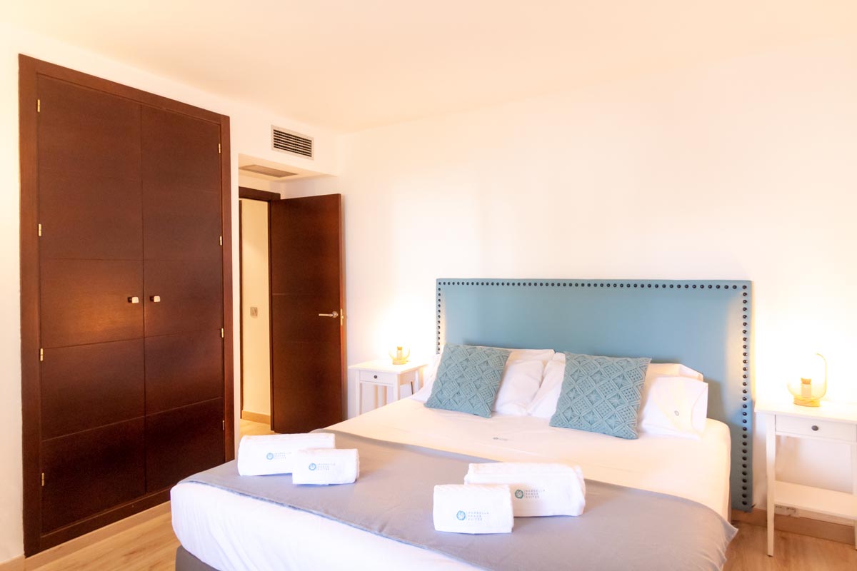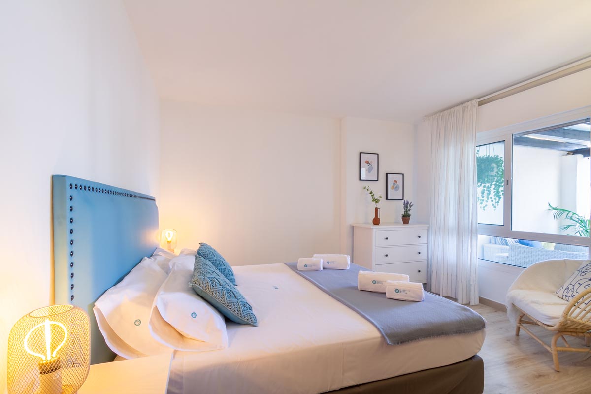 El espacioso dormitorio principal cuenta con una cama king-size (180 cm x 200 cm), un armario empotrado y ventanas directas que conducen a la terraza.