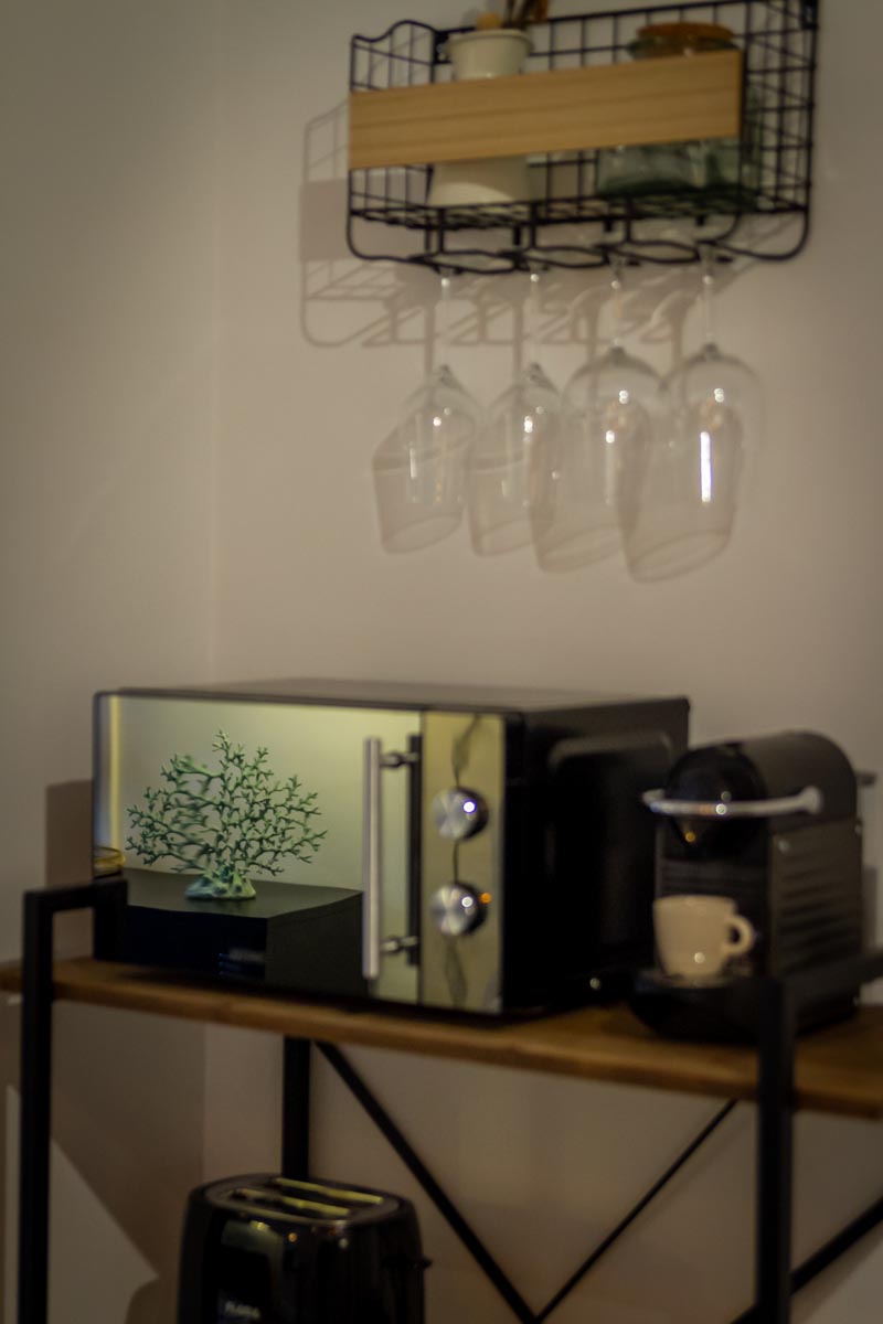 Hay una cocina abierta que incluye una estufa eléctrica, nevera-congelador, microondas, etc. La zona de estar/dormitorio tiene una cama tamaño queen y es el ambiente perfecto para un espacio acogedor.