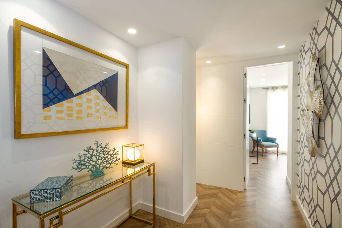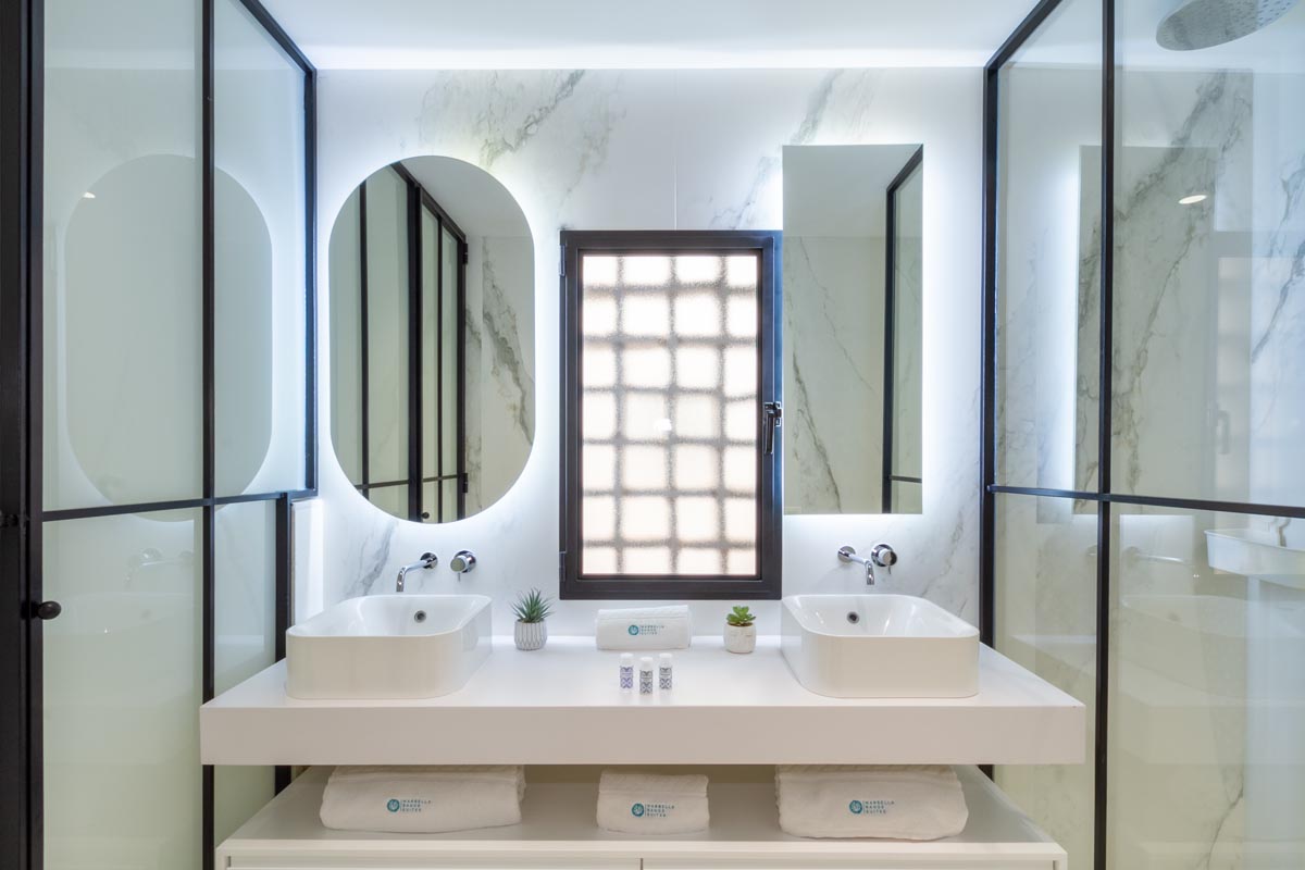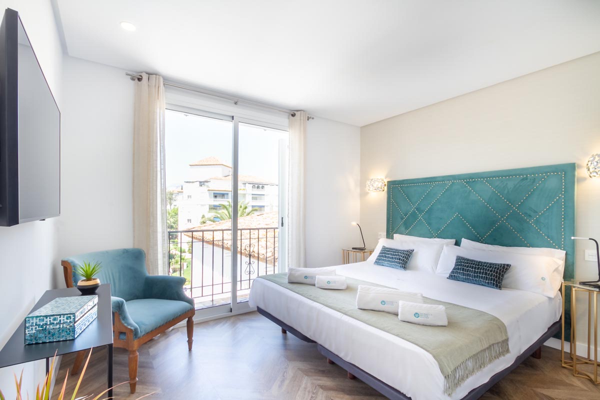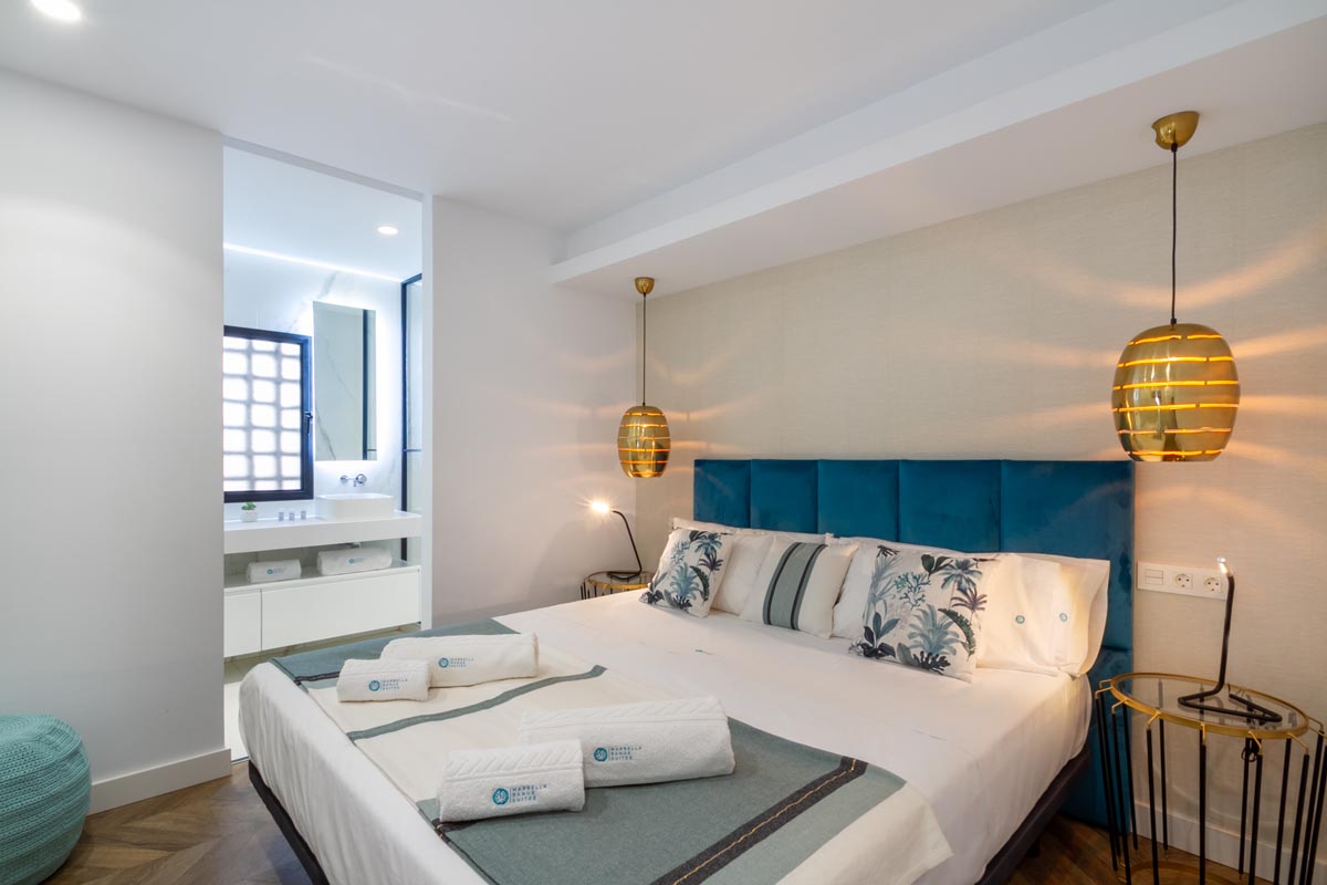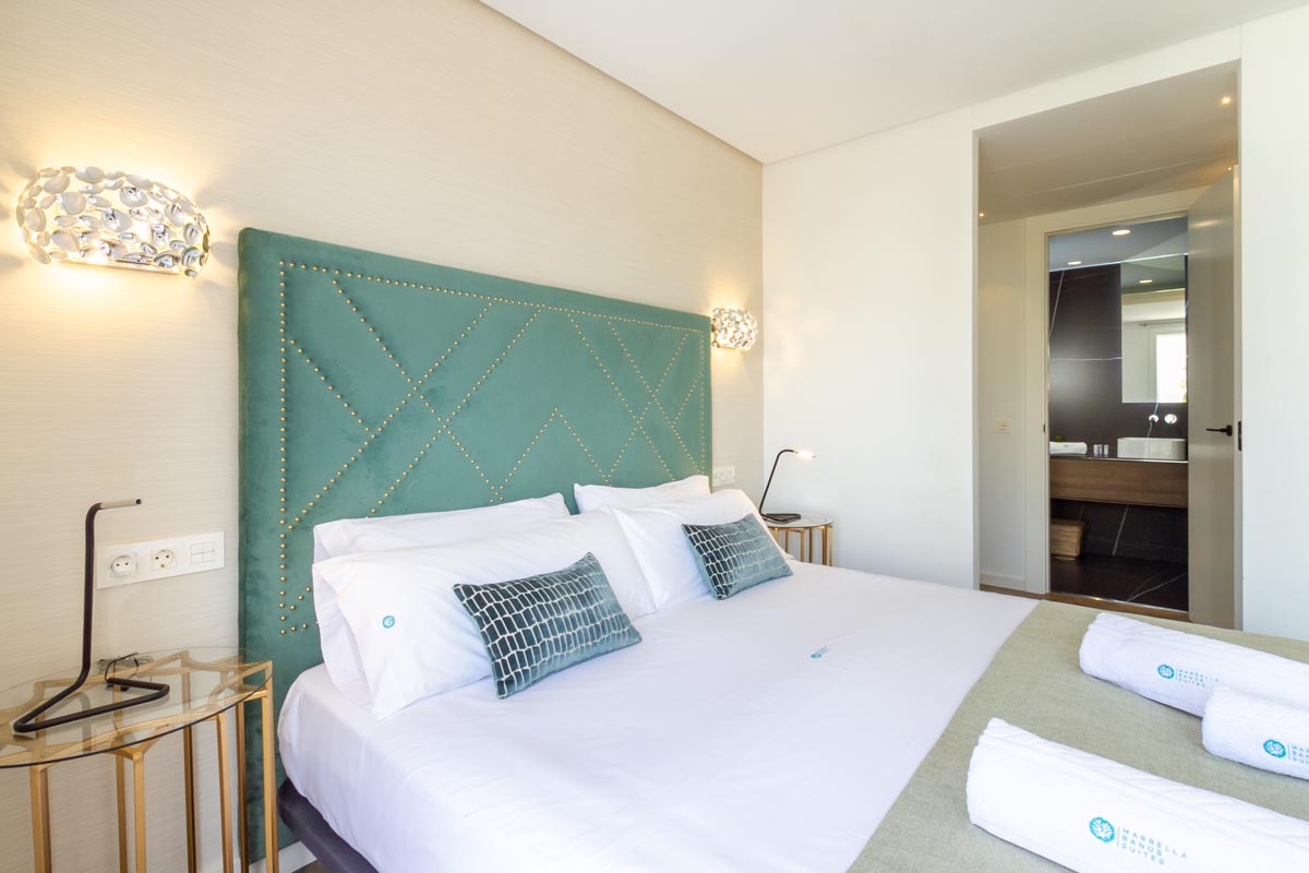 El espacioso dormitorio principal cuenta con una cama king-size (180 cm x 200 cm), armarios empotrados con caja de seguridad digital, TV y un baño en suite. El segundo dormitorio también cuenta con una cama king-size (180 cm x 200 cm), baño en suite, smart TV y una ventana con balcón español que da a la Avenida Playas del Duque.