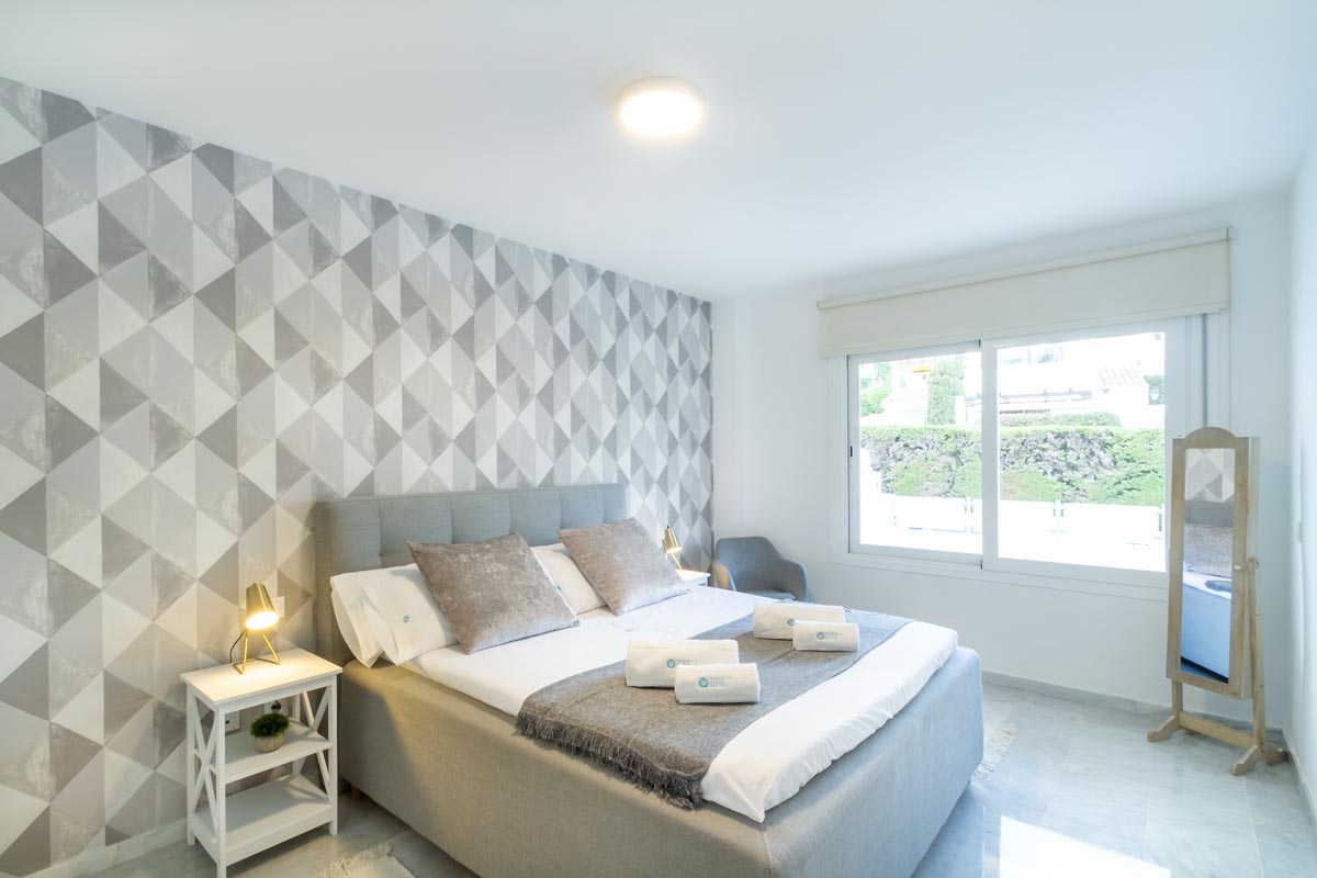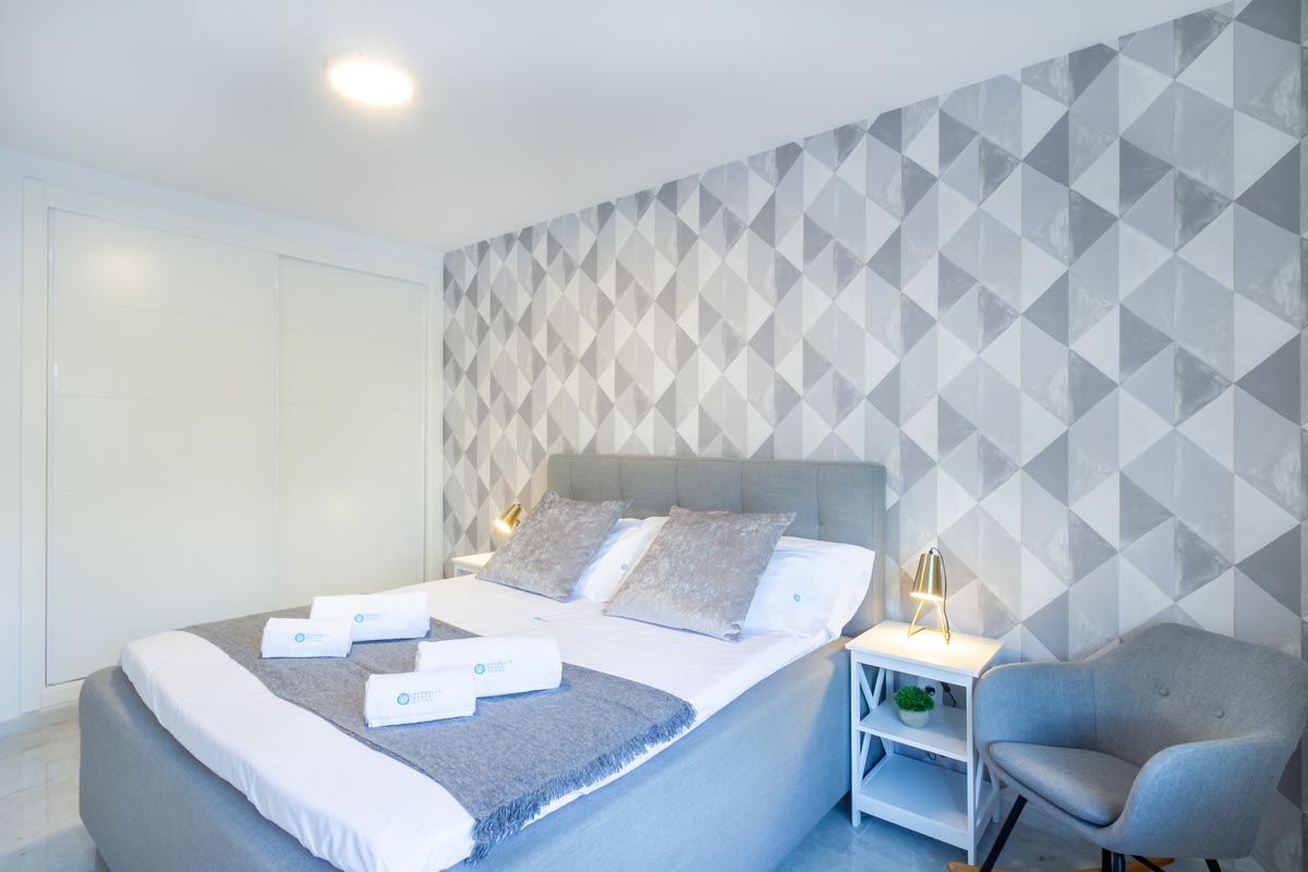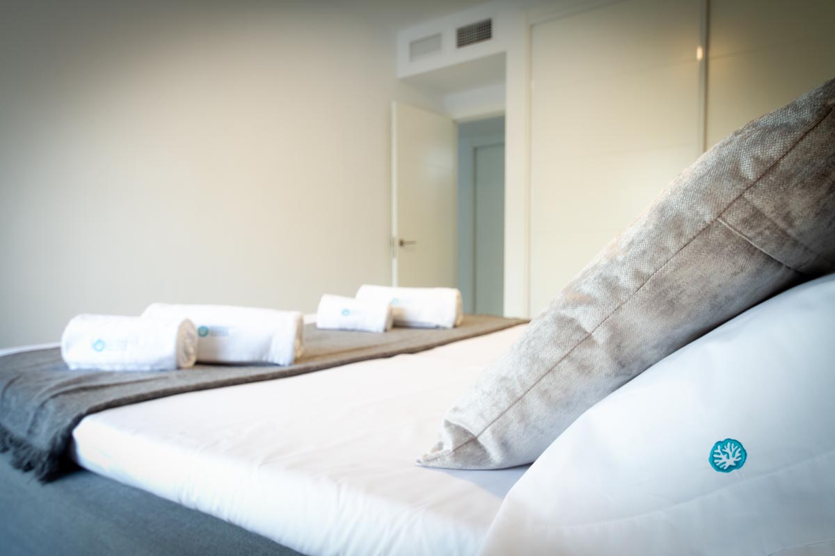 El amplio dormitorio principal cuenta con una cama queen-size y armarios empotrados. Los colchones tienen 30 cm de altura con espuma viscoelástica, y se proporcionan dos tipos de almohadas: viscoelásticas y de fibra hipoalergénica.